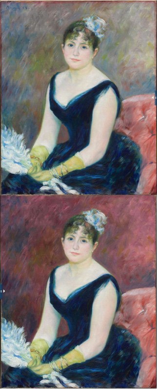 최근에 흥미로운 기사를 읽었습니다[1]. 시카고의 아트 인스티튜트의 관리자들이 르누아르의 <레옹 클라피송 부인 (Madame Léon Clapisson), 1883> 그림에서, 액자 밑에 가려져 있던 부분을 실마리로 유실된 안료의 미스터리를 풀었다는 내용이었죠.